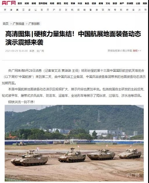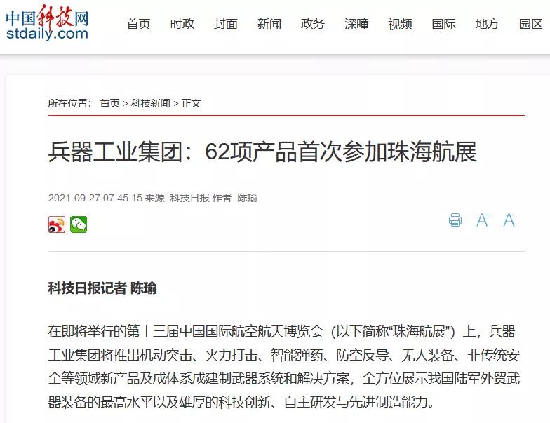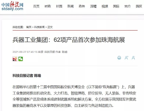 央廣網(wǎng):兵器工業(yè)集團(tuán)將展出150多項(xiàng)展品 超四成首展|中國(guó)航展萬(wàn)里行2021-09-30