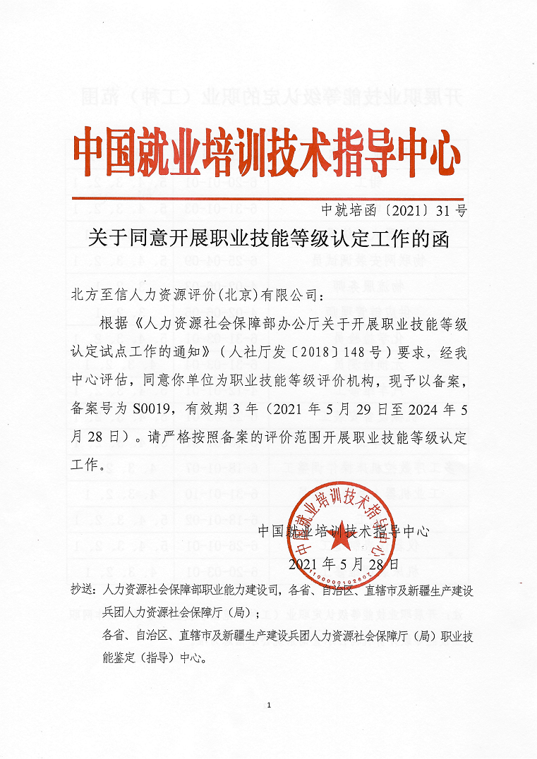 5月28日,人力資源社會(huì)保障部中國就業(yè)培訓(xùn)技術(shù)指導(dǎo)中心發(fā)布了《關(guān)于同意開展職業(yè)技能等級(jí)認(rèn)定工作的函》(中就培函〔2021〕31號(hào)),北方至信人力資源評(píng)價(jià)(北京)有限公司(以下簡(jiǎn)稱“北方至信”)成為首家央企全國性社會(huì)培訓(xùn)評(píng)價(jià)組織職業(yè)技能等級(jí)認(rèn)定機(jī)構(gòu)。